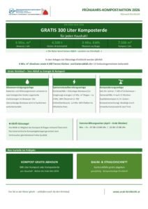 Frühjahrskompostaktion 2026 07.04.202631.03.2026 von Sigrid SchneiderBis Ende Mai gibt es 300 Liter Komposterde für jeden Haushalt gratis.… Weiterlesen Frühjahrskompostaktion 2026